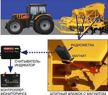 Система применяется на механических сеялках типа СЗС, СЗП, "Омичка” для облегчения визуального контроля за вращением сигнальных флажков на валах, а также на любых пневматических посевных комплексах в качестве датчика работы. Установка очень проста, т.к. система не содержит проводных соединений (рис. 1): на секции посевного комплекса крепятся радиометки, на сигнальные флажки напротив меток - магниты (любым способом), в кабине трактора - считыватель-индикатор (с подключением к бортсети). Факт остановки вала отображается включением соответствующего светодиода на индикаторе. При разворотах, остановках трактора естественно наблюдать включение всех значащих светодиодов. Один прибор может контролировать до 7 секций, автоматически настраиваясь на радиометки, установленные на них. Радиометки не требуют подключения питания - встроенная батарея обеспечит до 4 лет работы, после чего может быть заменена. Для увеличения срока службы батареи при консервации техники на зиму радиометки рекомендуется снимать и хранить при комнатной температуре. При подключении считывателя к системе мониторинга транспорта производится идентификация состава посевного комплекса (по номерам секций), а также регистрация начала/окончания вращения каждого из валов. С помощью программного обеспечения "Агронавт" можно получить карту обработки поля с учетом фактических мест начала/окончания высева (рис. 2). |